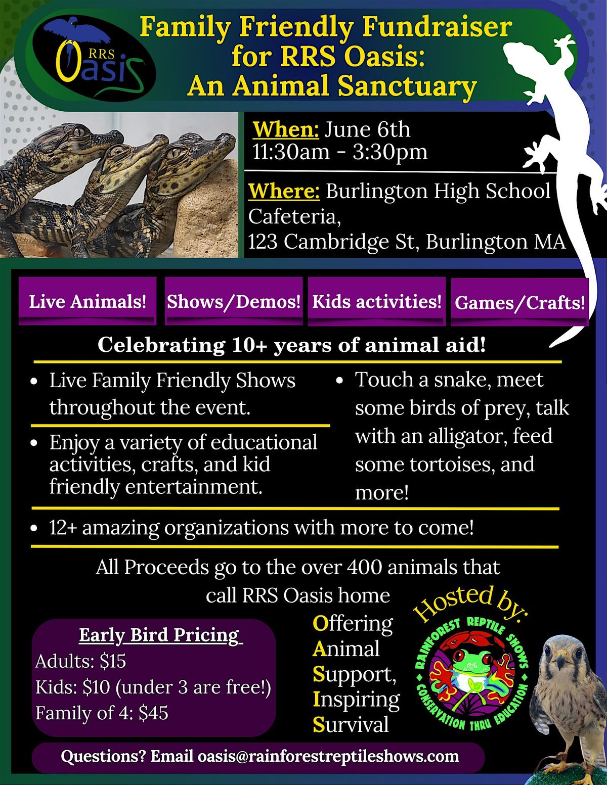 This event is a fundraiser for RRS Oasis Animal Sanctuary, a Beverly, MA-based 501(c)(3) nonprofit dedicated to rescuing and caring for over 400 animals. These include previously abused pets, unwanted pets, and illegally possessed animals confiscated by law enforcement.