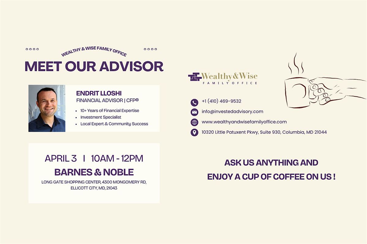 Our Wealthy & Wise Family Office advisors will be at Barnes & Noble at Long Gate Shopping Center to answer your questions and share insights on smart investing, retirement planning, and building long-term wealth.