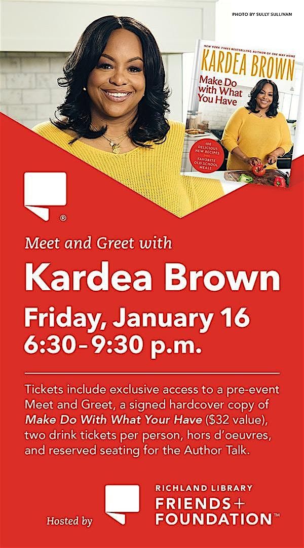 For those who want the opportunity to spend more time with the author, the Richland Library Friends and Foundation will host a pre-event Meet and Greet with Kardea Brown. Tickets are available for one person with one book or as a two-person package with one book. Both ticket options include admission to the pre-event Meet and Greet, a signed hardcover copy of Make Do With What You Have ($32 value), hors d’oeuvres, two drink tickets per person, and reserved seating for the author event starting at 7:30 p.m.