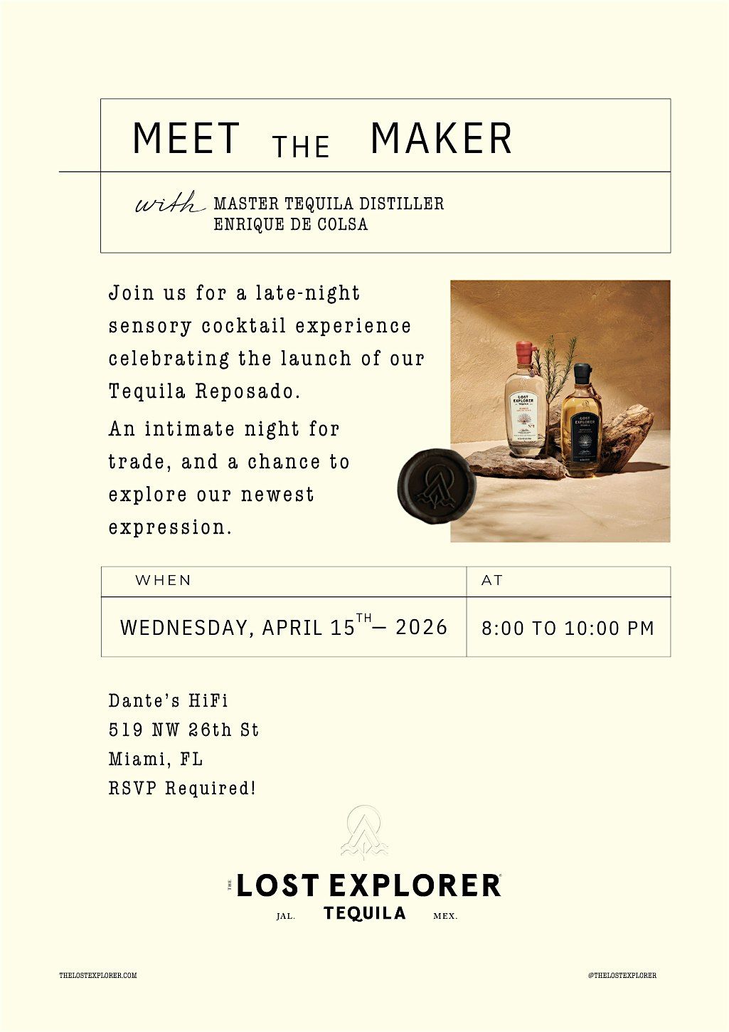 Join us for an exclusive in-person tasting with Enrique De Colsa, the mastermind behind The Lost Explorer's Reposado Tequila. Get ready to dive into the story and craftsmanship of this amazing spirit.