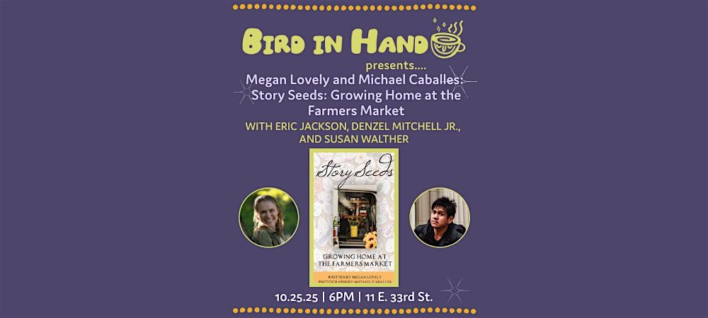 You're invited to a party about the 32nd Street Farmers Market! Bird in Hand is thrilled to launch Story Seeds: Growing Home at the Farmers Market, the result of a thoughtful, years-long project by author Megan Lovely and photographer Michael Caballes. After a morning at the market, the authors will join us at Bird in Hand, just a few blocks up the street, for a conversation with influential figures in Baltimore farming and farmers markets: Eric Jackson, Denzel Mitchell Jr., and Susan Walther.