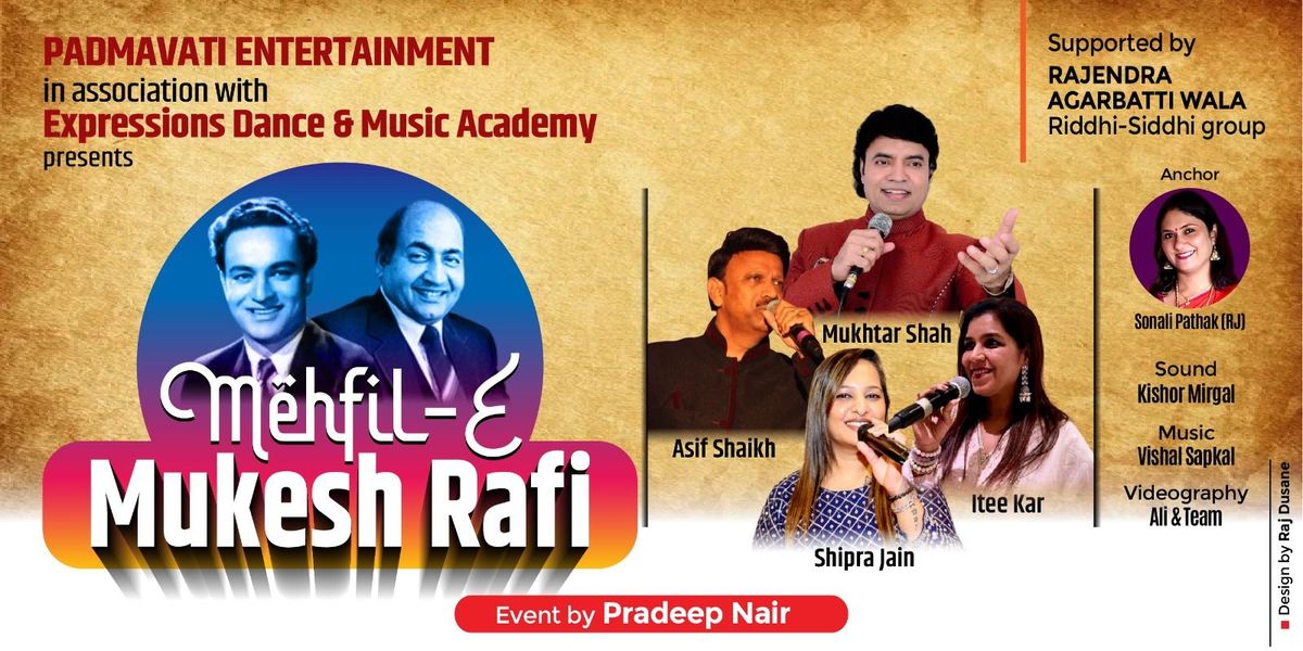 Padmavati Entertainment, in association with Expressions Dance & Music Academy, presents a grand musical show featuring the renowned singer Mukhtar Shah (Lead Vocalist). Known for his remarkable voice that mirrors the legendary Mukesh, the performance promises a nostalgic journey through Bollywood's golden hits.