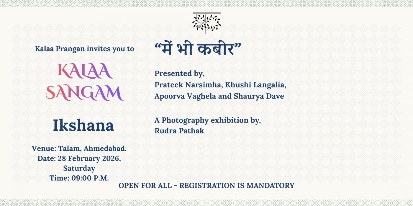 Join Kalaa Prangan for an intimate performance that explores the teachings of Kabir Das as a relatable, everyday presence rather than just a historical figure. Presented by Prateek Narsimha, Khushi Langalia, Apoorva Vaghela, and Shaurya Dave, it will be a wonderful evening of reflection and community.