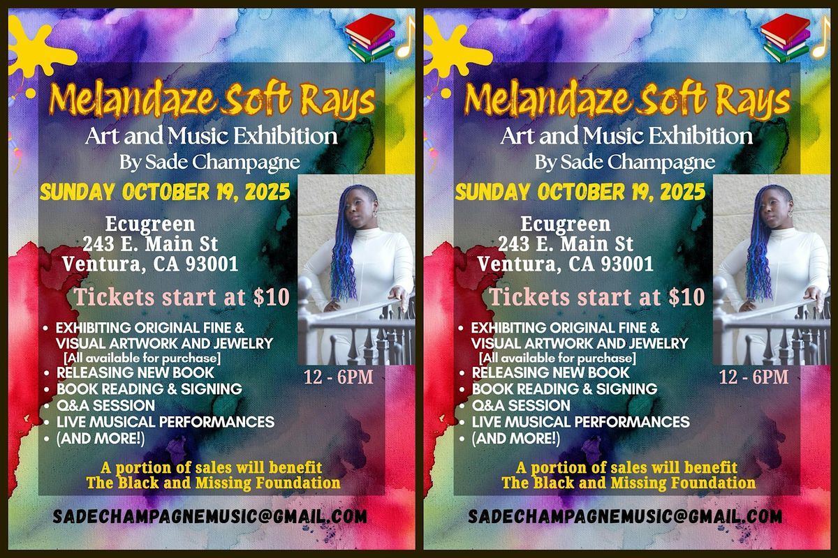 Welcome to the Melandaze Soft Rays Art & Music Exhibition! Join us at Ecugreen for a day filled with creativity, culture, inspiration, community and more presented by Sade Champagne. Immerse yourself in the beauty of original fine & visual art, jewelry all created by Sade Champagne. Soft rays of art and music that will captivate your senses. Sade Champagne is releasing her new book and will be doing a live book reading/signing, Q&A session, inspirational message, live musical performances and more. This in-person event promises to be a unique experience that you won't want to miss. Come and discover the magic of art and music coming together in perfect harmony. See you there!