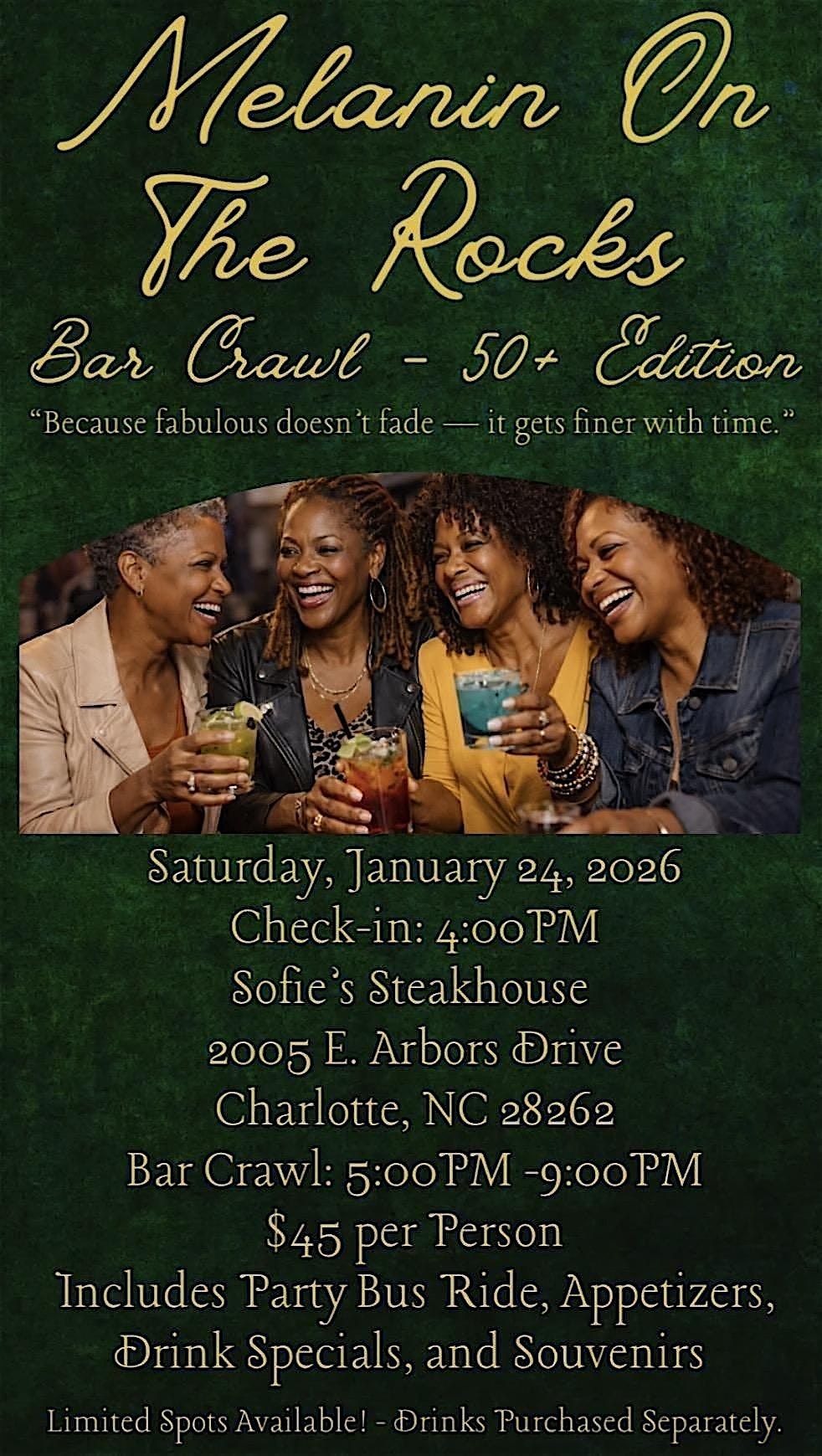 Brought to you by Five O'Nine, this bar crawl is specially created for Melanin Queens age 50 and up. "Because fabulous doesn’t fade — it gets finer with time." Check-in at Sophie's Steakhouse at 4PM for free appetizers and get to know the party bus crew. At 5PM we'll hop on the party bus stopping at bars around the city. We'll return to Sophie's at 9PM, and for those who can hang, continue the fun with good food and drinks, a DJ and dancing till midnight. Tickets are $45 per person which includes the party bus ride, appetizers, drink specials and souvenirs. Limited spots available and drinks purchased separately. This will be an unforgettable evening! Don't miss out!