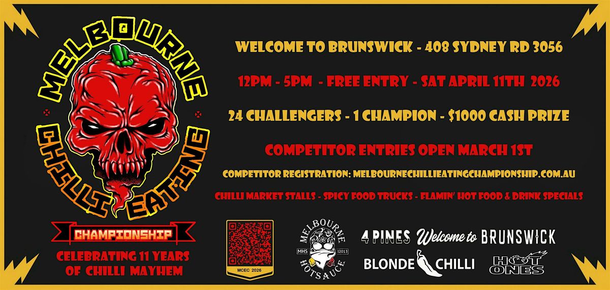 Founded in 2016 The Melbourne Chilli Eating Championship is back for 2026 bigger & better than ever before!Join us on Saturday 11th April at our brand new home in the spacious beer gardens of 408 Sydney Rd, 3056