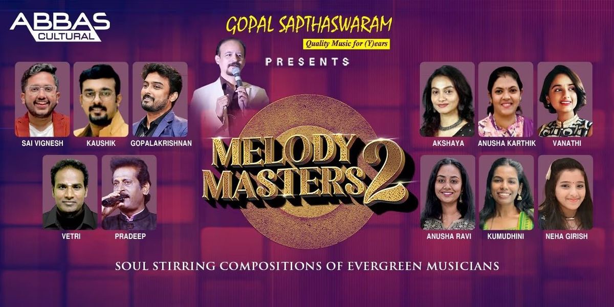 Gopal Sapthaswaram`s "Melody Masters" is a soul-stirring live musical extravaganza featuring 11 renowned singers paying tribute to the evergreen compositions of Tamil film music. The show will take the audience on a nostalgic journey through timeless classics, showcasing the rich musical heritage of Tamil cinema. The show will highlight the iconic works of legendary composers like M.S. Viswanathan, T.K. Ramamoorthy, Ilaiyaraaja, and A.R. Rahman, among others.The singers will perform soul-stirring renditions of evergreen Tamil songs that have become an integral part of the cultural fabric."Melody Masters" promises to be an unforgettable evening of music, nostalgia, and celebration of Tamil film music`s rich legacy. Get ready to be transported to a world of melodies that will leave you humming long after the show is over!