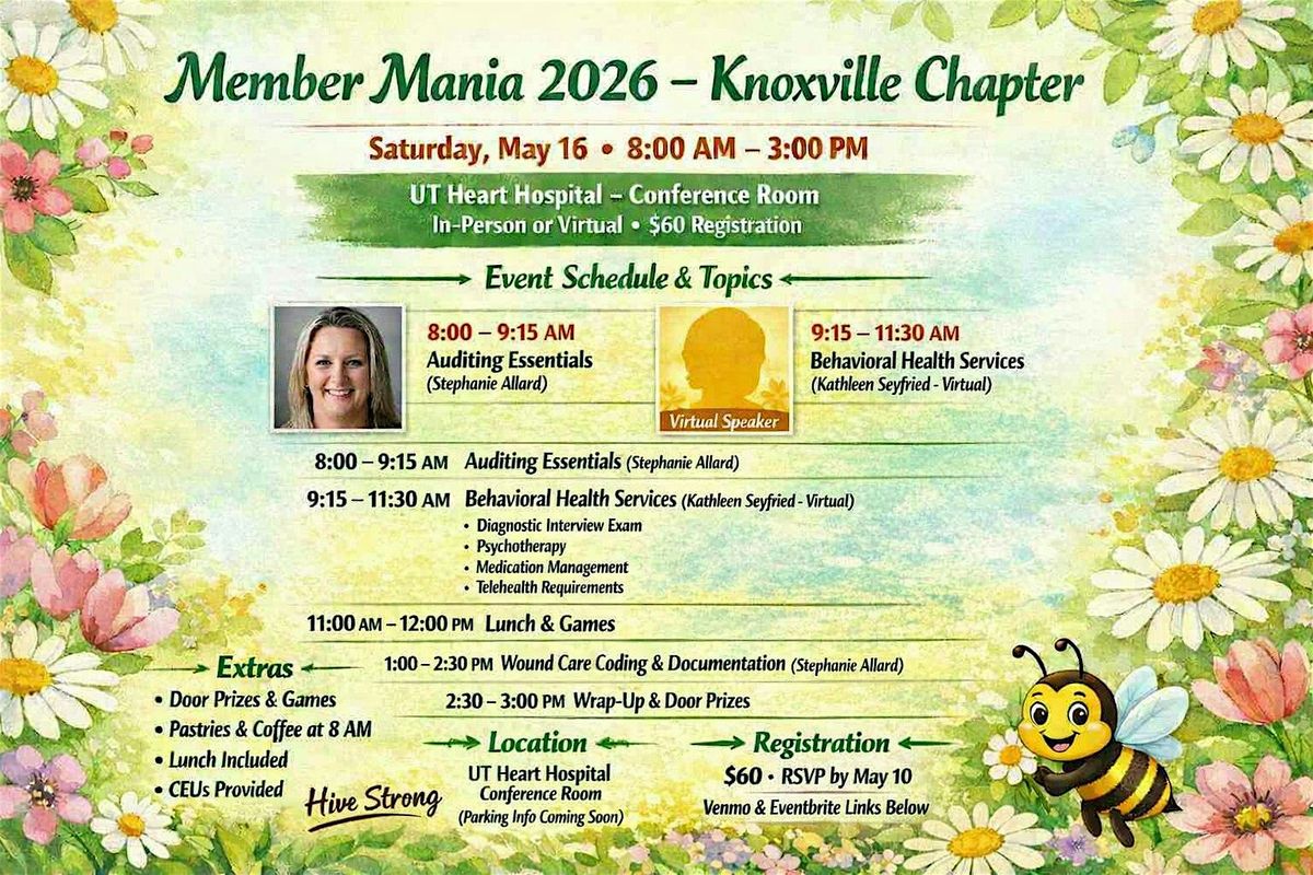 Join the Knoxville Chapter for a full day of education, networking, and fun. Whether you’re attending in person or virtually, this event brings together coders, auditors, and healthcare professionals for 6 CEUs, games, and great conversation.