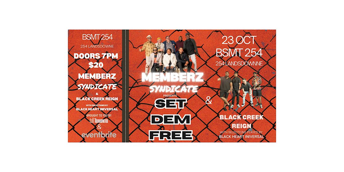 For years, Memberz Syndicate has been a self-sustaining contemporary roots force in Toronto's reggae community. With an ever-evolving line-up, the band is nowa nonet, providing a variety of styles for dancers and listeners alike: lovers rock, classic hits, militant and Rasta-conscious lyricism and relationship songs. The same assortment of genres are present on their debut album Set Dem Free which is being released on October 22nd and being celebrated with a show the following day at BSMT254, on Thursday October 23rd, with support from T.O. reggae/rock stars Black Creek Reign and Black Heart Iniversal on the decks.