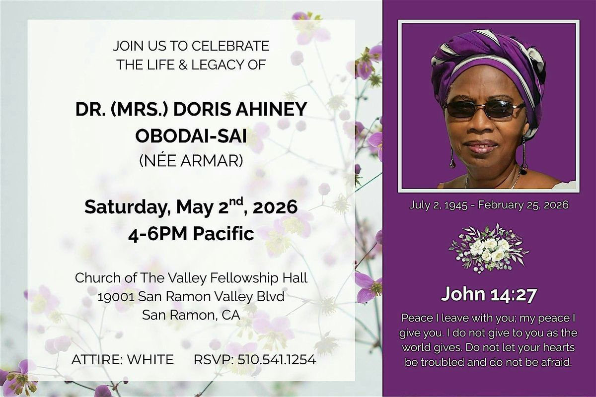 Join us to celebrate the life & legacy of Dr. (Mrs.) Doris Ahiney Obodai-Sai. Kindly direct inquiries to [email protected] or 510.541.1254.
