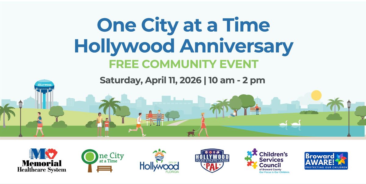 Join us for the One City at a Time (OCAT) Hollywood Anniversary on Saturday, April 11, from 10 am to 2 pm at Boggs Park & Sports Complex in Hollywood. This collaborative event is hosted by in partnership with the City of Hollywood, Hollywood PAL, and the Children’s Services Council, working together to support and uplift local families.