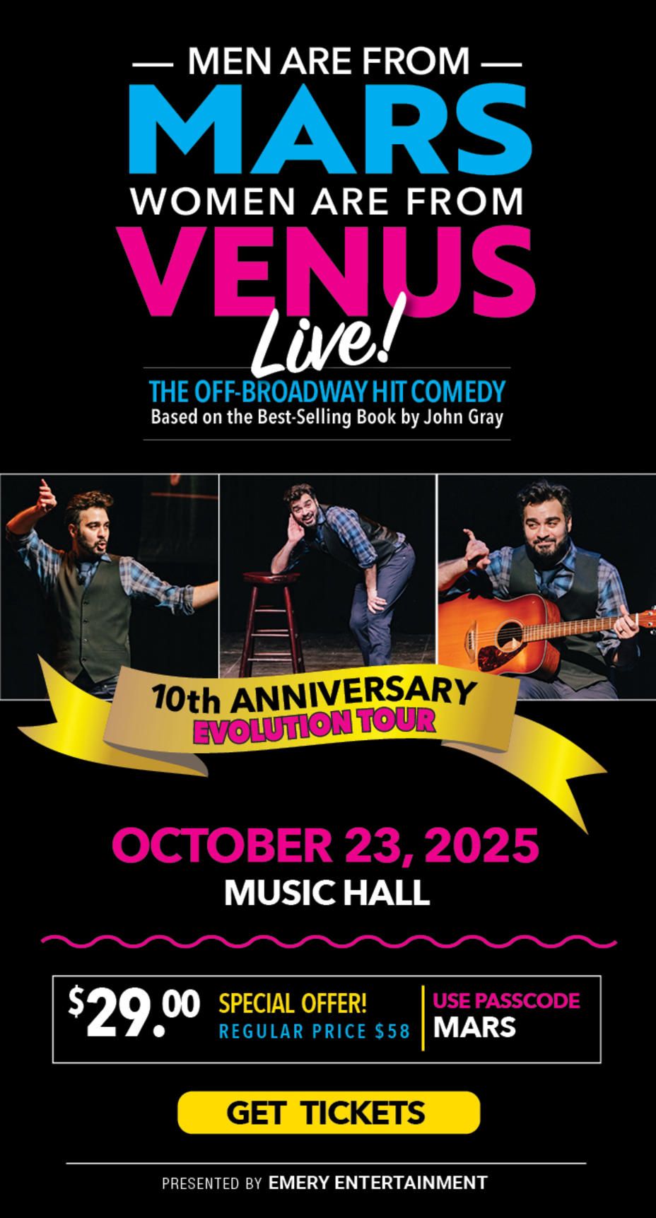 β¨ Enter a world of endless possibilities at Men Are From Mars Women Are From Venus at Music Hall Center - Detroit, where every moment tells a story! ποΈ The stunning Music Hall Center - Detroit in vibrant Detroit, MI transforms into a realm of wonder on October 24th, 2025 at 07:30 PM. π They have crafted an experience that goes beyond the ordinary, combining elements of surprise, delight, and pure entertainment. Every detail has been thoughtfully considered to ensure your journey with us is nothing short of extraordinary. π― Join fellow adventure seekers and memory makers in this celebration of imagination and innovation. π Reserve your spot today and be part of something truly special!