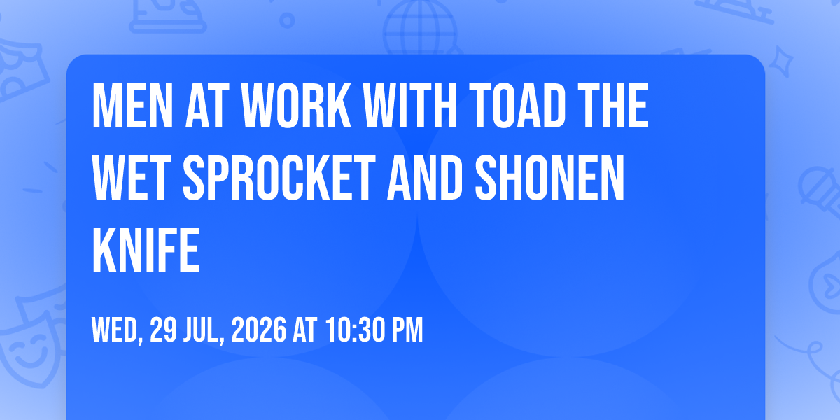 π Location: 44.7951, -68.7739π Prepare to be amazed at Men At Work with Toad the Wet Sprocket and Shonen Knife, the most anticipated gathering of the season! π Set against the stunning backdrop of Maine Savings Amphitheater in vibrant Bangor, ME, this event promises to redefine your expectations. π Mark your calendars for July 29th, 2026 at 10:30 PM and get ready to immerse yourself in an atmosphere of wonder and excitement. β¨ From the moment you arrive, you'll be transported into a world where memories are made and stories come alive. They have crafted an experience that perfectly harmonizes entertainment, innovation, and community spirit. π Join us as we create moments that will be discussed for years!