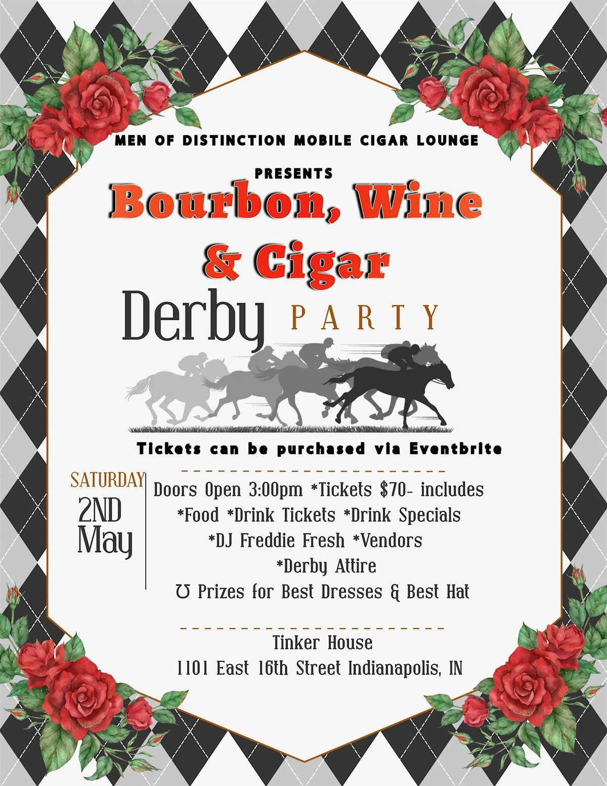 Bourbon, wine, cigars, vendors, DJ vibes, Derby fits, and prizes. Join Men of Distinction on May 2 at Tinker House!
