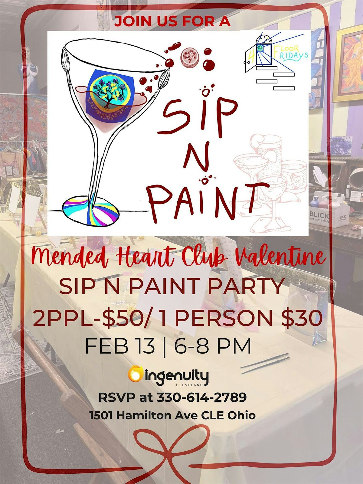 Get ready for a fun and relaxed in-person event where you can sip your favorite drink and unleash your inner artist! Whether you're a pro or just wanna have some laughs, this Valentine Sip N Paint is the perfect vibe to celebrate love, friendship, and creativity. Come join us for a memorable evening filled with colors, smiles, and great company! Followed by the Art Opening of In Love with Art inside LemonChrystal Artist Sanctuary. $50 for two and $30 for one person! Learn to paint a snowglobe of Cleveland with artist Lennon and Chrystal with your friend or lover!