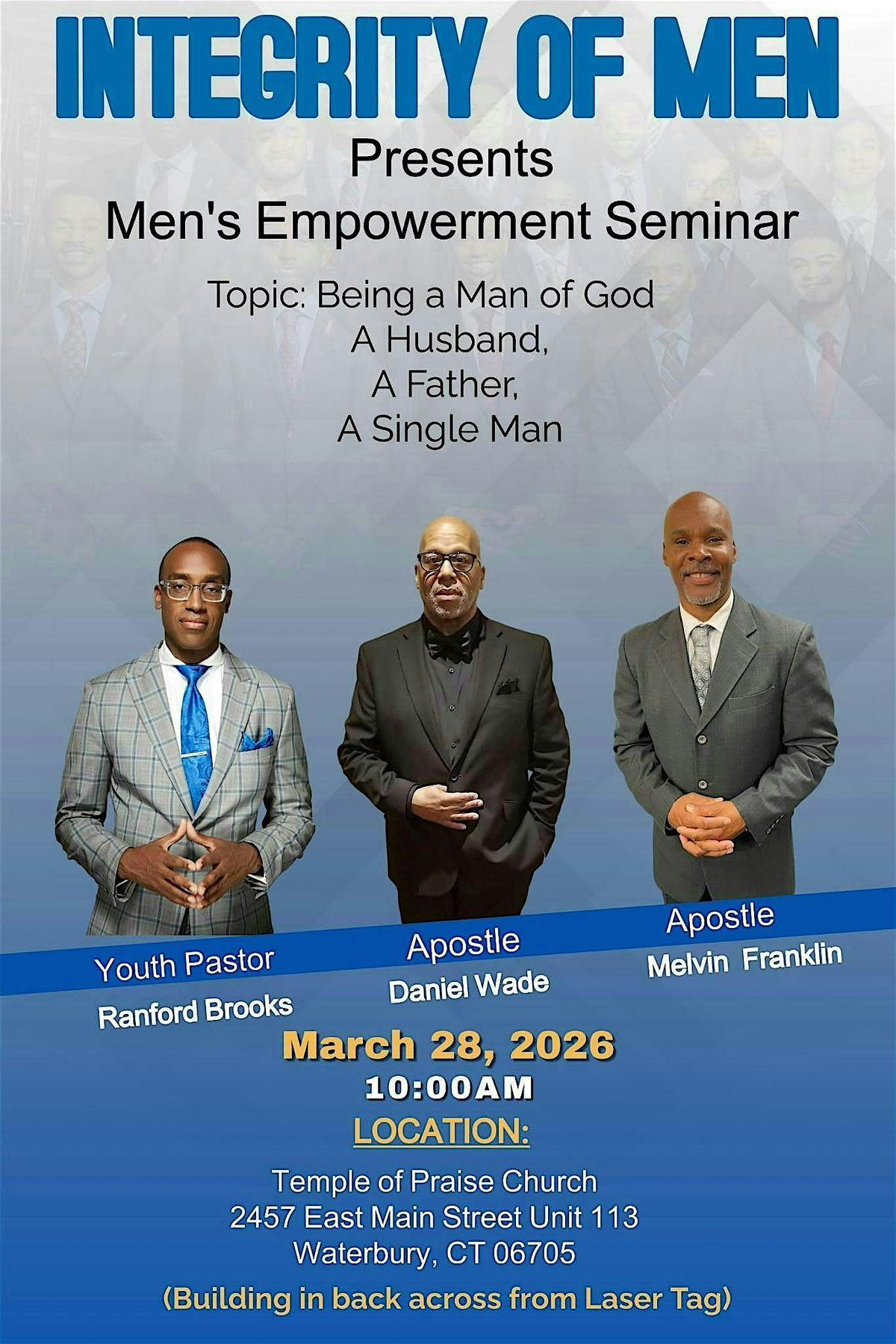 Join us for an in-person gathering designed to build confidence, deepen connections, and ignite your God-given potential. This seminar focuses on spiritual growth, leadership, and practical tools to help you live boldly as a man of God. Meet like-minded brothers, engage in honest conversation, and participate in prayer and teaching that equips you for real-life challenges. Come ready to share, learn, and leave strengthened and empowered—don’t miss this chance to step into greater purpose and impact.