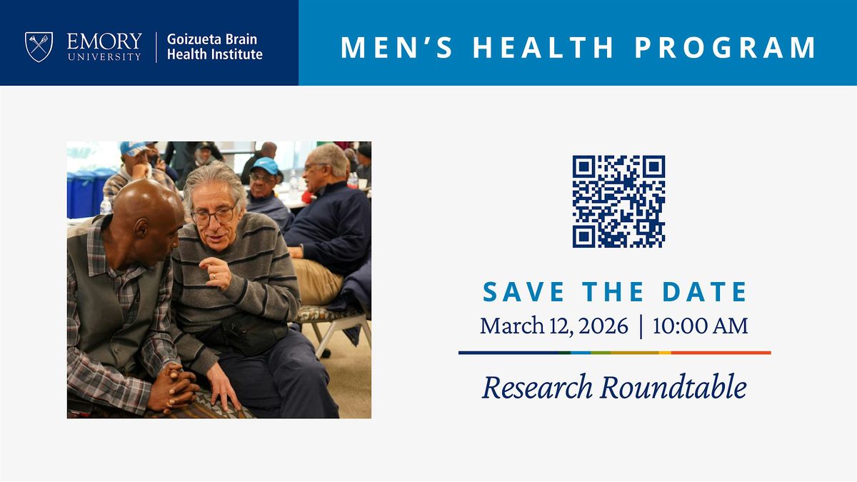 Men, make plans to attend the Men's Health Program at the Emory Brain Health Center in Atlanta. Register today! The theme for March 2026 is Research Roundtable which promotes discussions around research participation and encourages open, honest dialogue among men regarding their health.