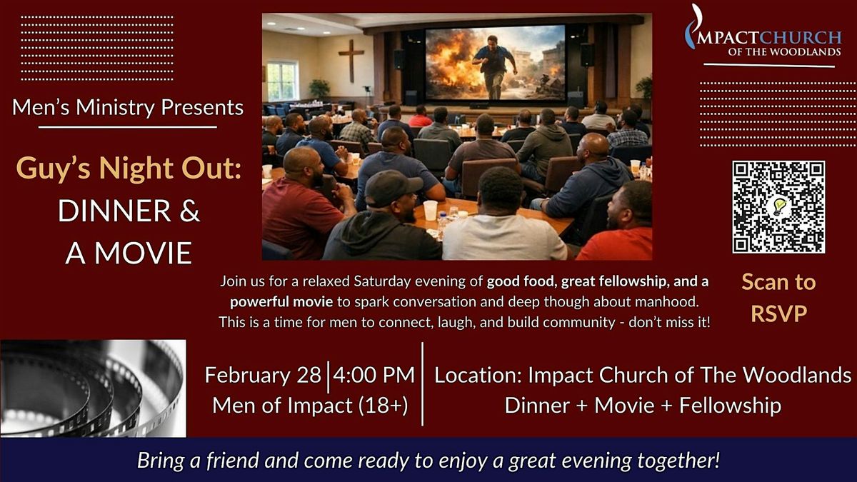 You are cordially invited to attend the Men’s Ministry Dinner & Movie hosted by Impact Church of The Woodlands.