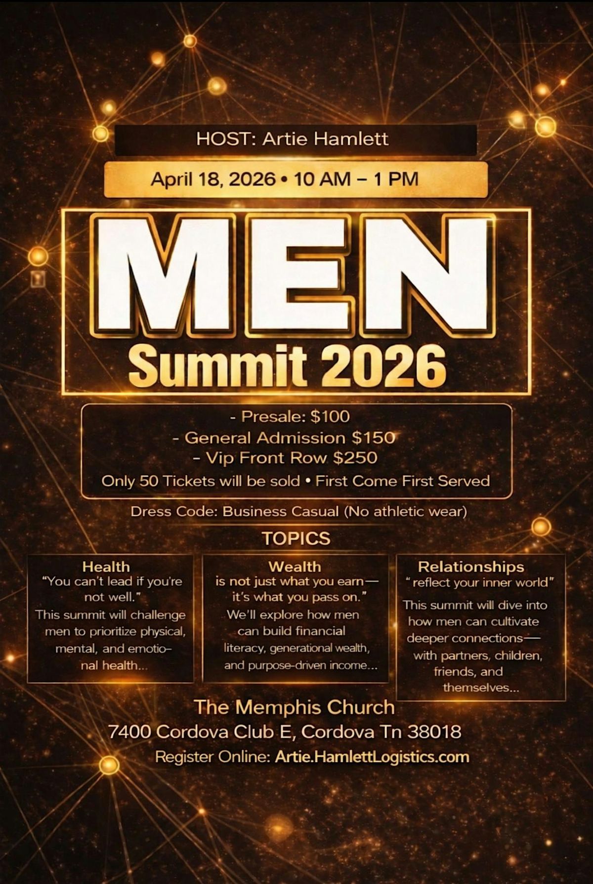 MEN Summit 2026: Health, Wealth, Relationships. April 18 • Memphis • Only 50 seats. Register: Artie.HamlettLogistics.com