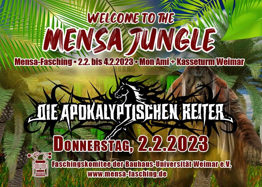 Der legendäre Mensa-Fasching geht in die nächste Runde! Auftakt-Veranstaltung am Donnerstag mit unserer diesjährigen HighLightBand „Die Apokalyptischen Reiter“. Wer sie auf #Wacken verpaßt hat, dem sei dieser Termin wärmstens empfohlen...!Ticketverkauf online (via Ticket Shop Thüringen):