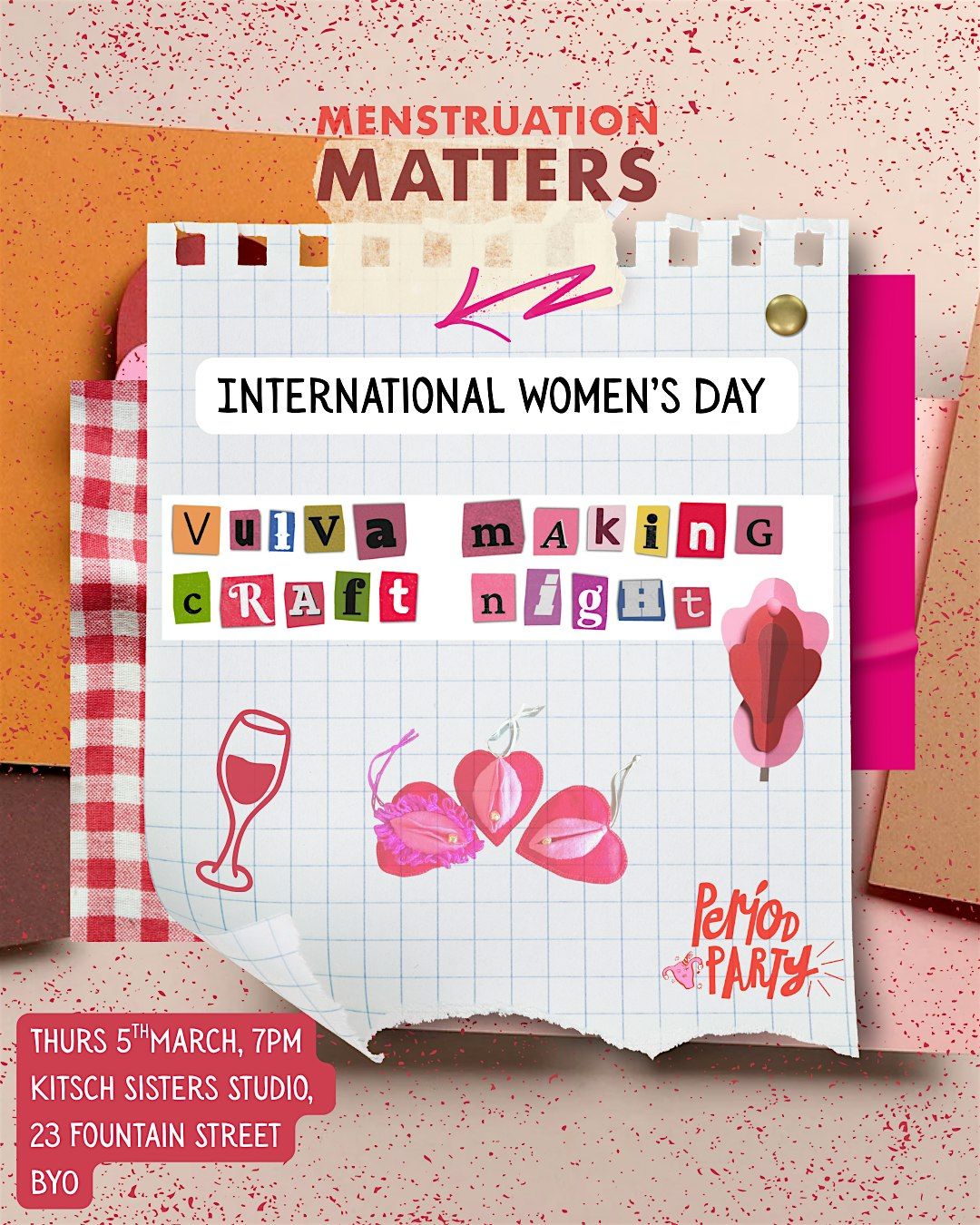 Join us at Kitsch Sisters Studio and expect a night of period games, a talk from @katiepmdd, vulva arts & crafts, music, merch, and prizes.