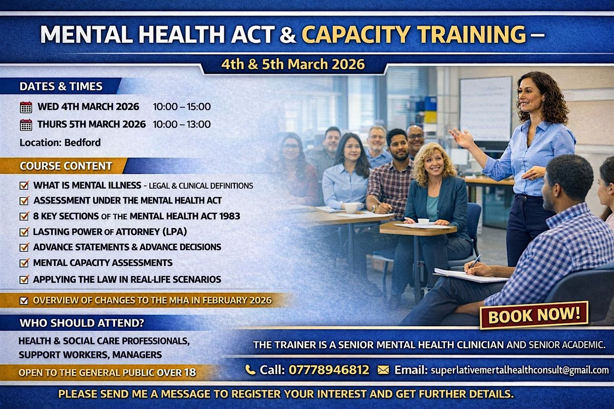 This comprehensive two-day training provides a practical and up-to-date overview of the Mental Health Act (MHA) and Mental Capacity Act (MCA), designed to build confidence in applying the law safely and effectively in real-world practice.