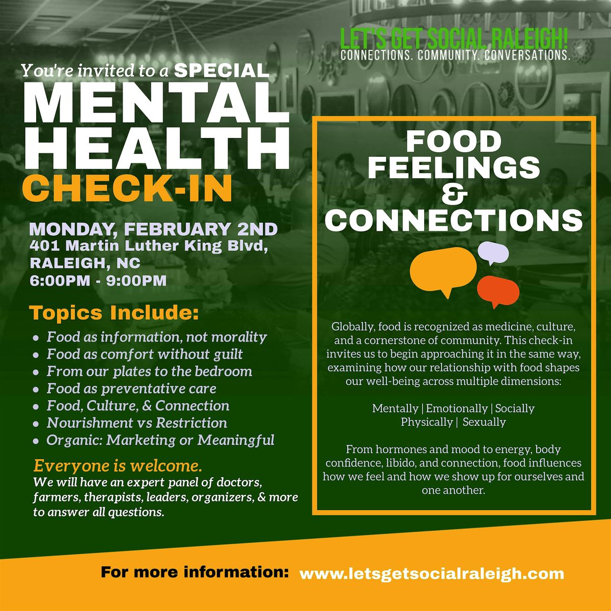 Join us for Mental Health Check-In: Food, Feelings & Connection, a preventative wellness conversation centered on how food impacts our overall well-being beyond diet culture and restriction.Globally, food is recognized as medicine, culture, and a cornerstone of community. This check-in invites us to begin approaching it in the same way, examining how our relationship with food shapes our well-being across multiple dimensions: