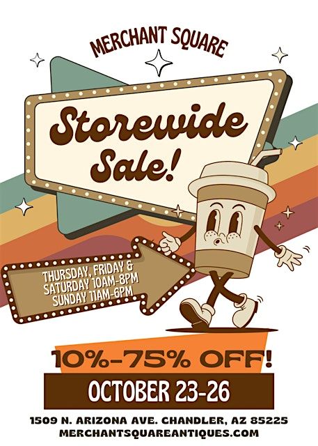Come on down to 1509 N Arizona Ave for our epic storewide sale where ALL vendors will be up to 75% off! Discover hidden treasures, unique finds, and one-of-a-kind antiques at unbeatable prices. With items ranging from vintage furniture to retro collectibles, there's something for everyone. Don't miss out on this opportunity to score some amazing deals and add a touch of history to your home. We're open from 10am-8pm on October 23rd-October 25th, and from 11am-6pm on October 26th. See you there!