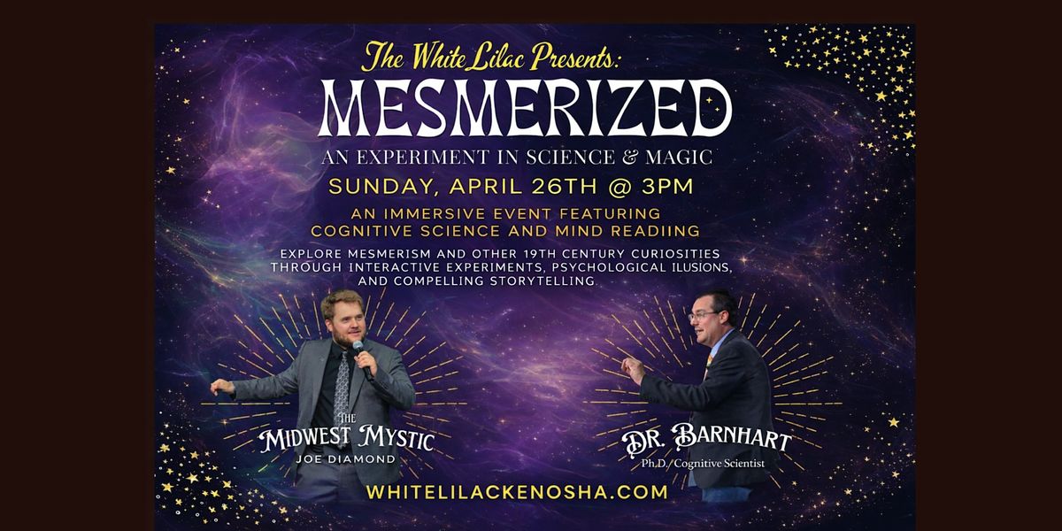 In the mid-19th century, science and the supernatural shared the same parlor. Spiritualists claimed the dead could speak, mesmerists healed with a touch, and early psychologists began seriously studying belief, suggestion, and perception. In Mesmerized, cognitive scientist and magician Dr. Anthony Barnhart joins forces with acclaimed mentalist Joe Diamond for an immersive afternoon inspired by that strange and fascinating era. Dr. Barnhart, whose research focuses on attention, perception, and the psychology of belief, has lectured and performed at institutions including Carthage College, Johns Hopkins University, and the University of Richmond, blending rigorous science with live demonstrations that reveal how easily the mind can be influenced. Joe Diamond, known nationally as “The Midwest Mystic,” has appeared on Penn & Teller: Fool Us and has performed for theaters, corporations, and universities across the country, earning a reputation for intelligent, theatrical, deeply interactive performances that place the audience at the center of the mystery. This is not a hypnosis show and no one is embarrassed or singled out; instead, you’ll experience elegant psychological illusions and participatory experiments that may challenge what you believe about your own mind.