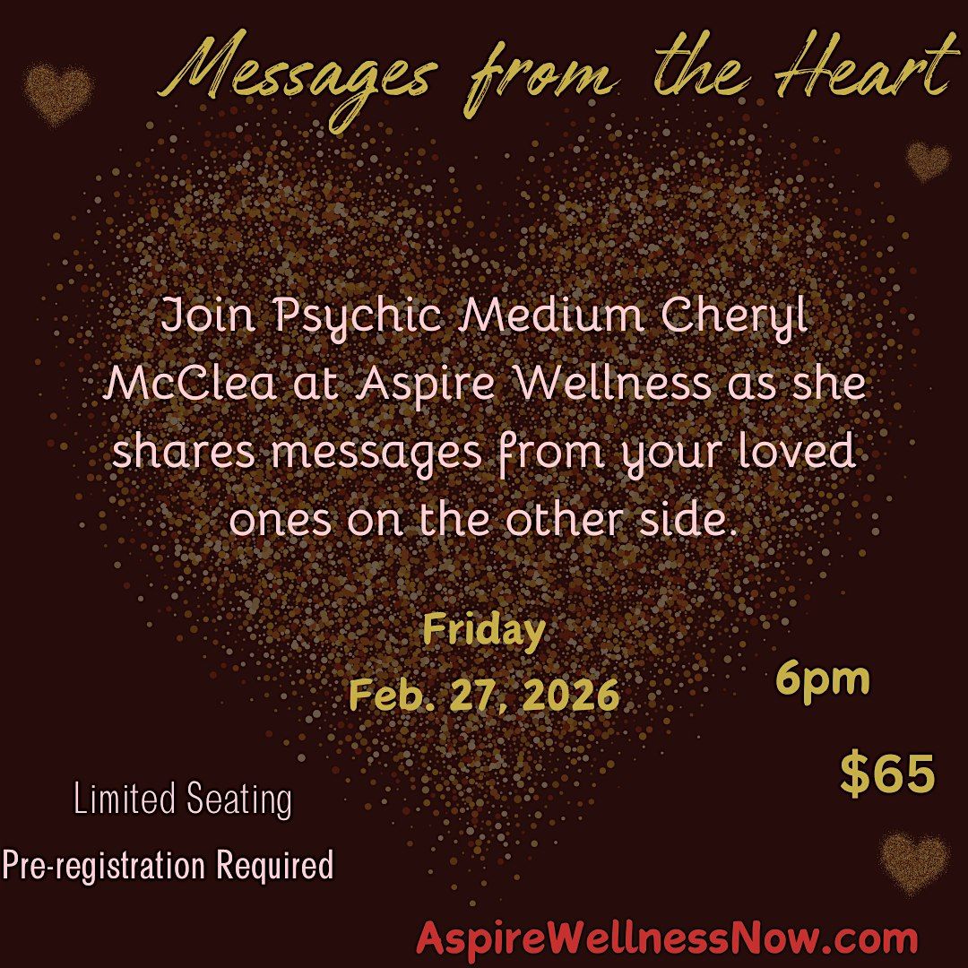 Join Psychic Medium, Cheryl McClea, as she connects with your friends and family that have passed. Does someone have a message for you? Or are you looking for guidance from someone ? Register for this event and find out.