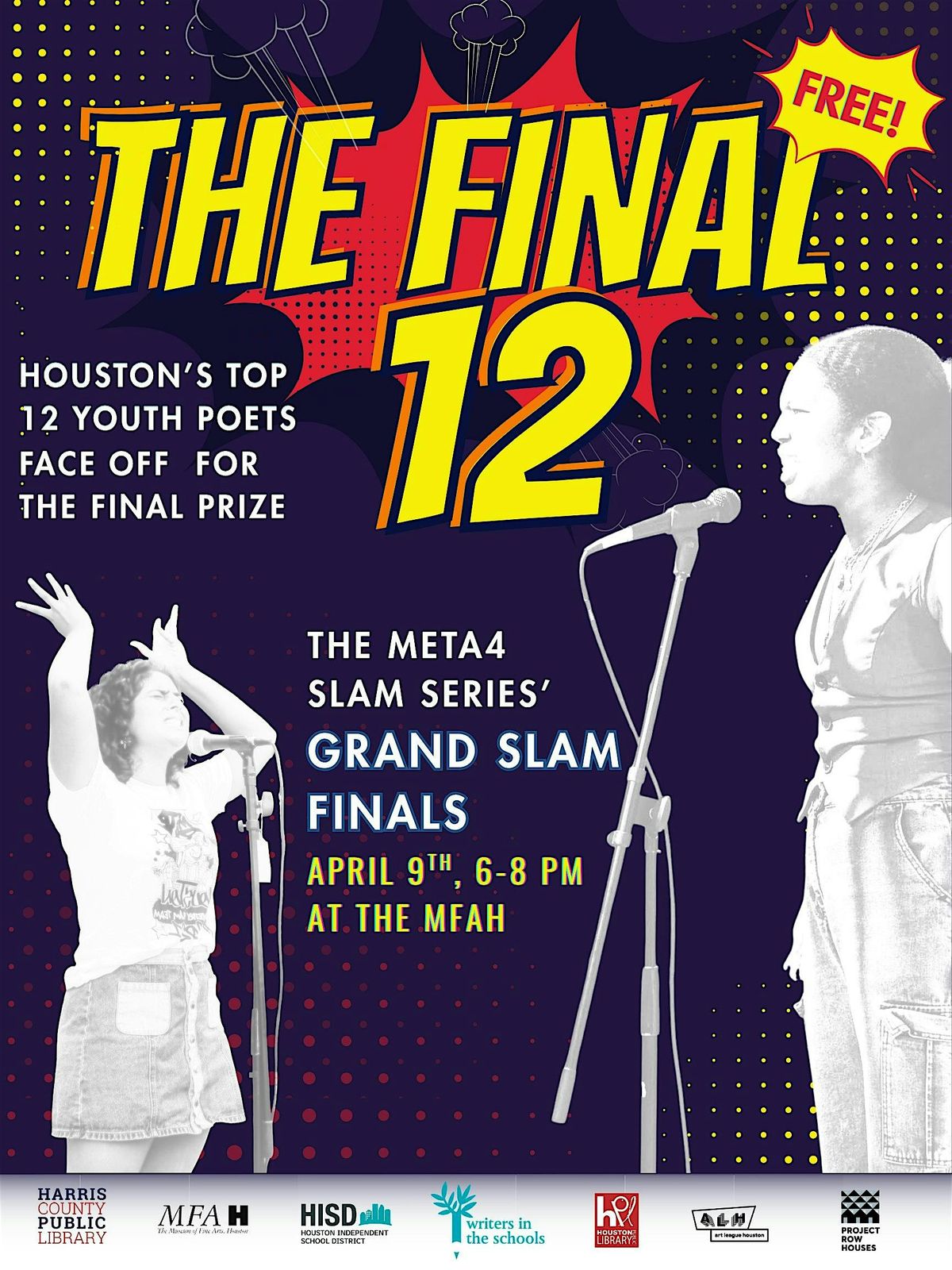 Houston's top 12 youth poets will gather to compete for one of six spots on Meta4's national poetry team, including a Poetry Fellowship prize of $1,000 and travel to the Brave New Voices slam poetry competition. These poets have been selected through qualifiers and their performance at semi-finals, and now they will perform in a final round of competition. Join us for an exciting night of slam poetry at the Museum of Fine Arts' Wyatt Theater.