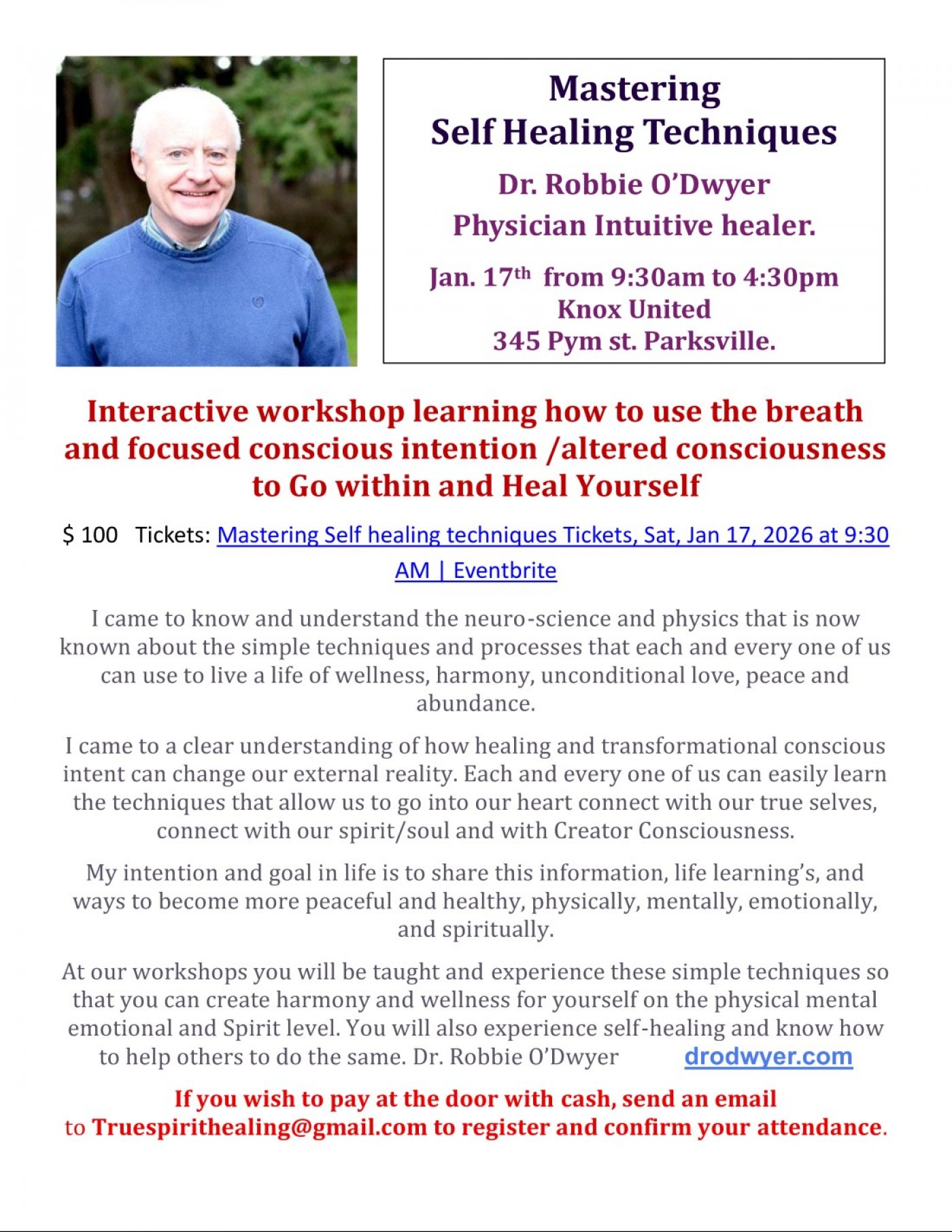 Jan. 17th full day workshop in Parksville with Dr Robbie O Dwyer, Physician Intuitive Healer.