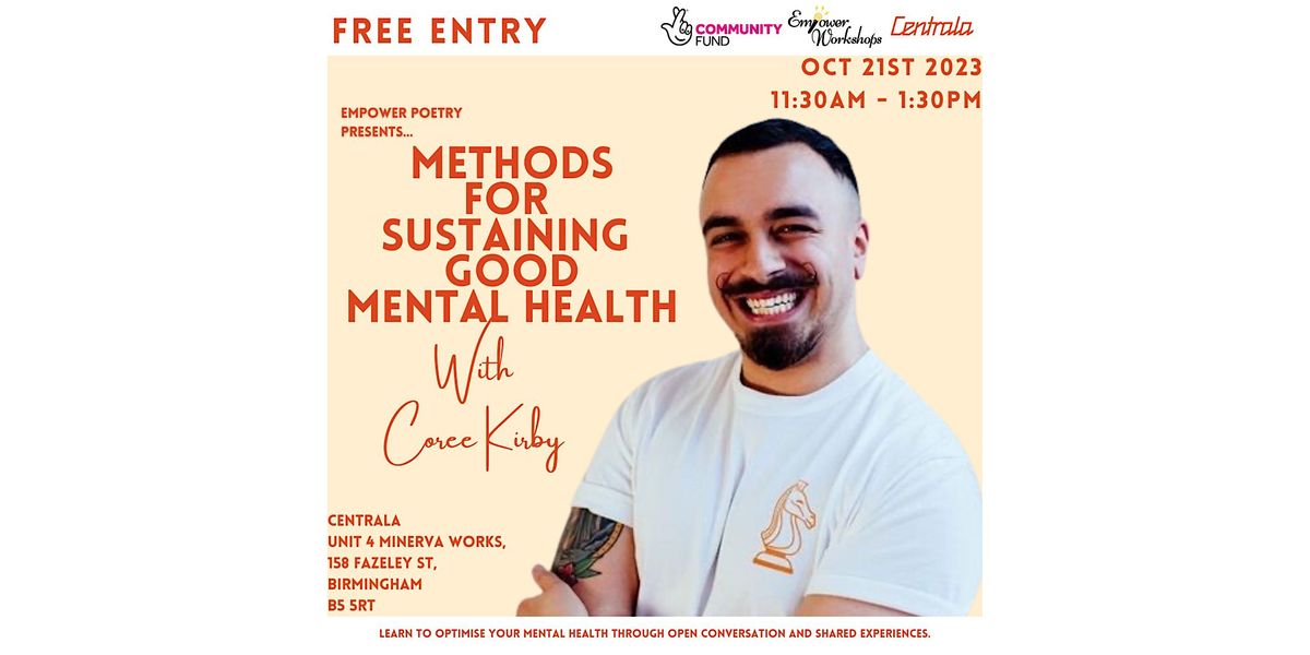 Join us for an inspiring workshop with mental health expert Coree Kirby, where he will share valuable insights on sustaining good mental health. This in-person event will take place on Sat Oct 21, 2023 at 11:30 AM in Birmingham, at Unit 4 Minerva Works, 158 Fazeley St, B5 5RT.