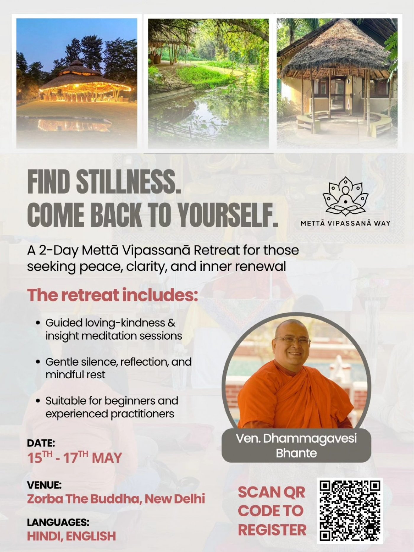 Experience the balancing blend of Metta (loving-kindness) and Vipassana (insight) at our upcoming weekend retreat in Delhi.