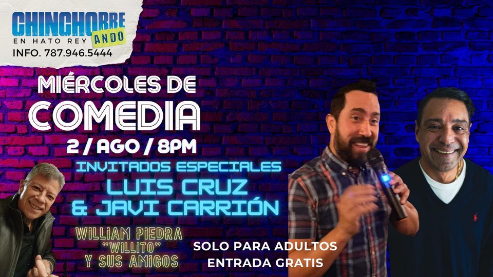 ?? Este Miércoles a las 8PM tenemos tres por uno… ? Estamos de fiesta porque llegan Luis Cruz y Javier "Javi " Carrion quién viene de Estados Unidos y es Ganador de varios premios en el género del Standup Comedy (entre ellos el Bud Light Standup comedy festival) ? Ellos estarán junto a William Piedra para hacerte reir en Grande?? Separa con tiempo y despide el verano a Carcajadas! ☎️ 787-946-5444! ?️ ENTRADA GRATIS