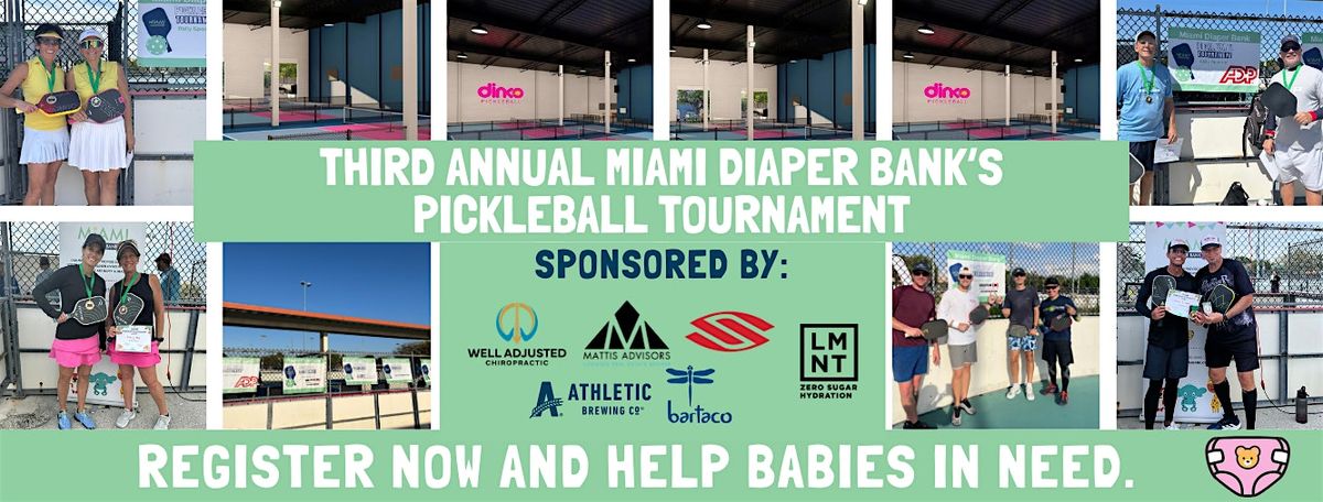Miami Diaper Bank's Third Annual Pickleball Tournament details are as follow: NEW VENUE: Dinko Pickleball Complex Miami (Indoors with A/C)