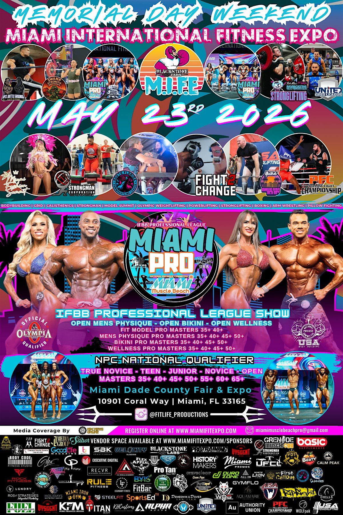 Speaheaded by Miami's ONLY IFBB Olympic Qualifier & NPC National Qualifier, the IFBB Miami Pro & NPC Miami Muscle Beach in Bodybuilding powered by the IFBB Professional League & NPC. The Pro Show will feature PRO OPEN Categories Bikini, Wellness & Men's Physique plus IFBB Masters in Mens Physique, Fit Model, BIkini & Wellness.
