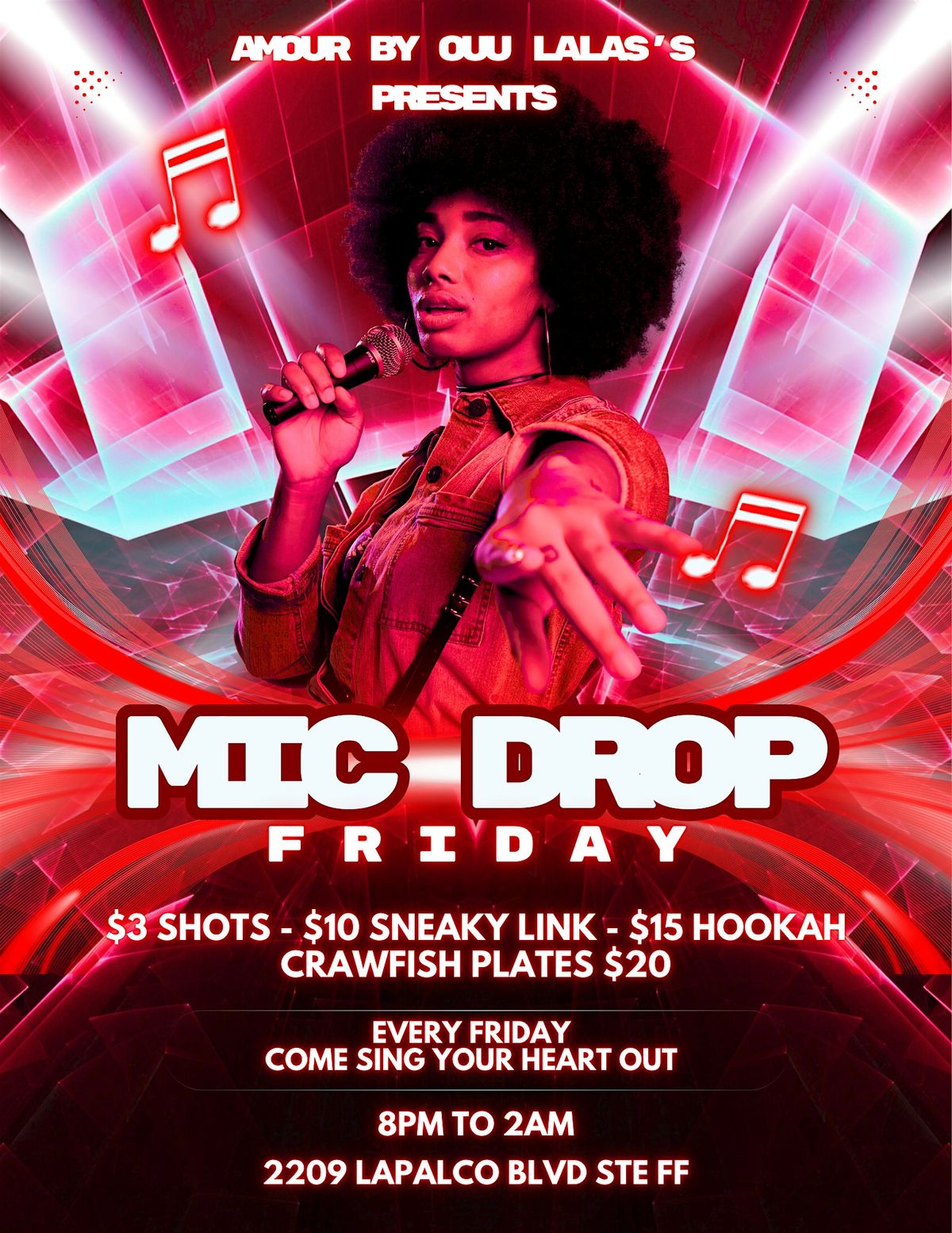 Welcome to MIC Drop Fridays at Amour by Ouu LaLa’s! Open Karaoke! Sing your favorite songs from all genres — pop, rock, country, R&B — whatever gets you hyped! Spotlight Moments: Grab the mic, step up, and own your performance in front of a lively crowd. Community Energy: Cheer on fellow singers, make new friends, and enjoy a supportive atmosphere where everyone gets a chance to shine.Whether it’s belting out Beyoncé, hitting high notes like Whitney, or jamming to classic favorites with friends, Mic Drop Fridays are about confidence, fun, and unforgettable memories under the lights.Don't miss out on the chance to sing the night away with friends and make memories that will last a lifetime. See you there!