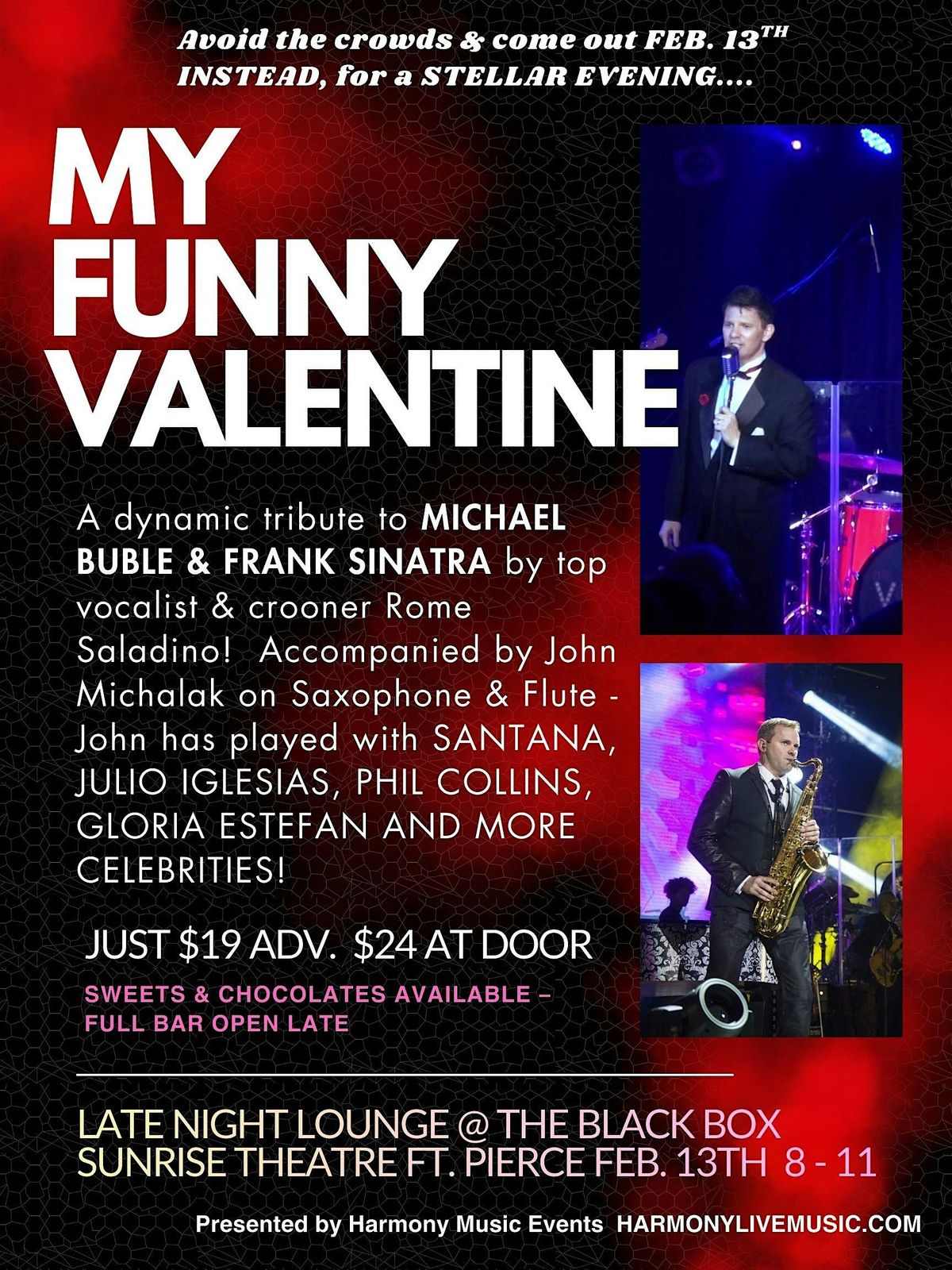 Instead of the crowded restaurants on Feb. 14th, celebrate Valentines on Feb. 13th with a top notch music show full of romantic ballads, dance songs, and lively classics! "My Funny Valentine" is a TRIBUTE TO MICHAEL BUBLE AND FRANK SINATRA, and has gotten rave reviews in South Florida. Rome Saladino is a top notch crooner vocalist, and guest Saxophonist John Michalak has played with Gloria Estefan, Santana, Julio Iglesias and Phil Collins, among other celebrities.