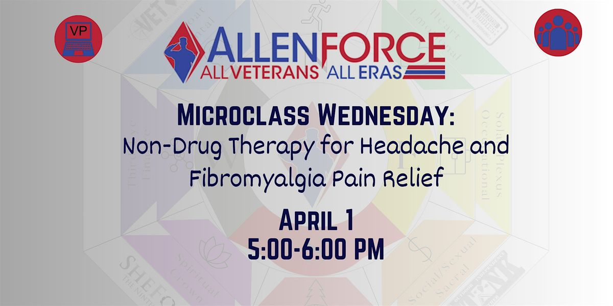 Join us for an informative session focused on non-drug therapy options available to Veterans for the treatment of headaches and fibromyalgia. This class will introduce innovative, non-invasive treatment modalities.