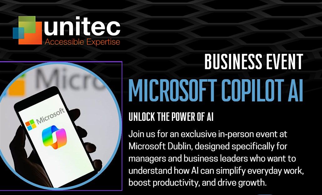 Get ready to dive into the future with Microsoft's AI Copilot right here in Dublin! This in-person event is your chance to explore cutting-edge AI tech, connect with fellow enthusiasts, and see how AI can boost your productivity in real life. Come hang out, learn, and be inspired by the power of AI—no suits, just smart minds and cool ideas. Don't miss out on this exciting day!