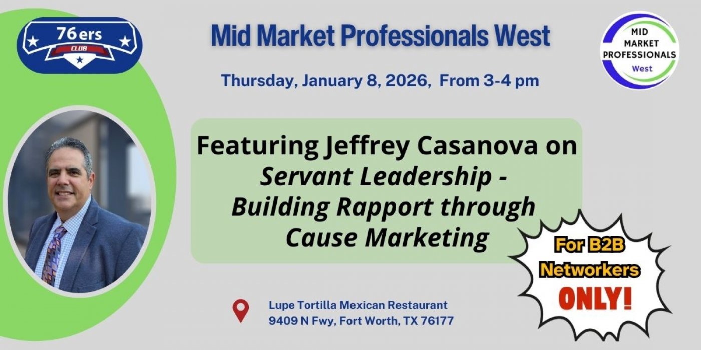 At Mid Market Professionals West we're passionate about the potent power of networking. We've carefully crafted this event to connect clever B2B networkers, ONLY, (not B2C) who reside work or target businesses in the 76xxx zip codes.