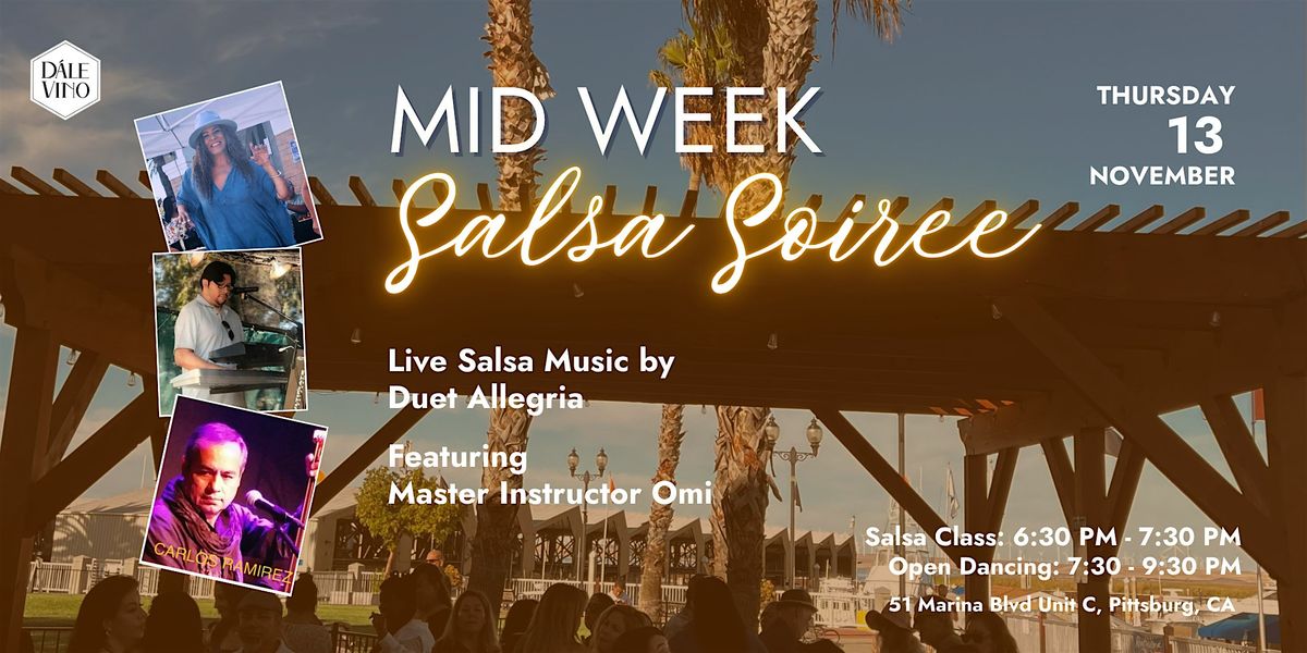 Get those dancing feet ready for the weekend at Dále Vino's Mid Week Salsa Soiree. Join Master Instructor Omi for a beginner-friendly intro to Salsa and more ($11 class fee) accomapnied by live music, while sipping on your favorite libations. Then dance the night away to live Salsa sounds by Duet Alegria!