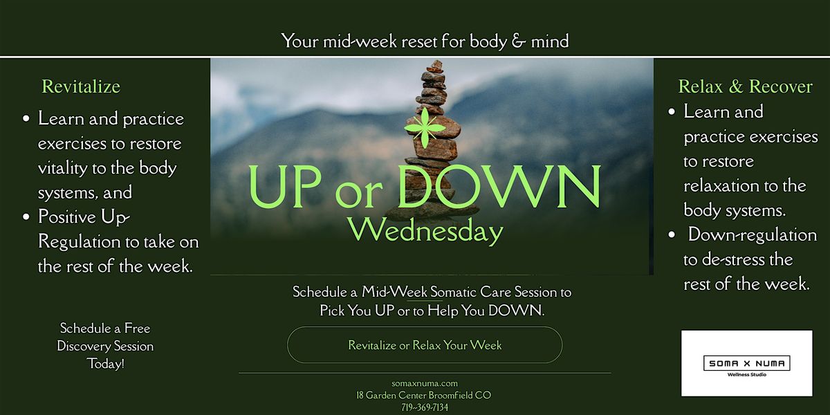 Wednesday is the day that can make or break the work week. Some weeks, you may need a midweek recharage to get you through until Friday. Other weeks, the stress and tension may be so overwhelming that you may not feel you can make it until Friday. UP/DOWN Wednesday at SOMAxNUMA Wellness Studio is for you no matter which direction you need to go.