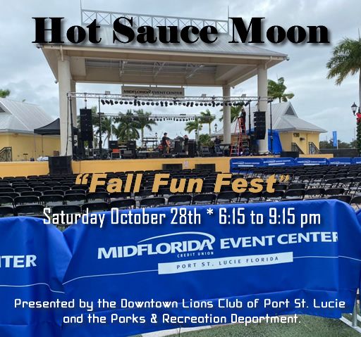 Hot Sauce Moon is the final act for the Saturday Night Show in Port St. Lucie. Three-day festival of music and fun. We are looking forward to this amazing musical venue at this beautiful outdoor event. Bring your chairs and join us on the lawn.Fall Fest is Co-produced by the Downtown Lions Club of Port St. Lucie and the Parks & Recreation Department.