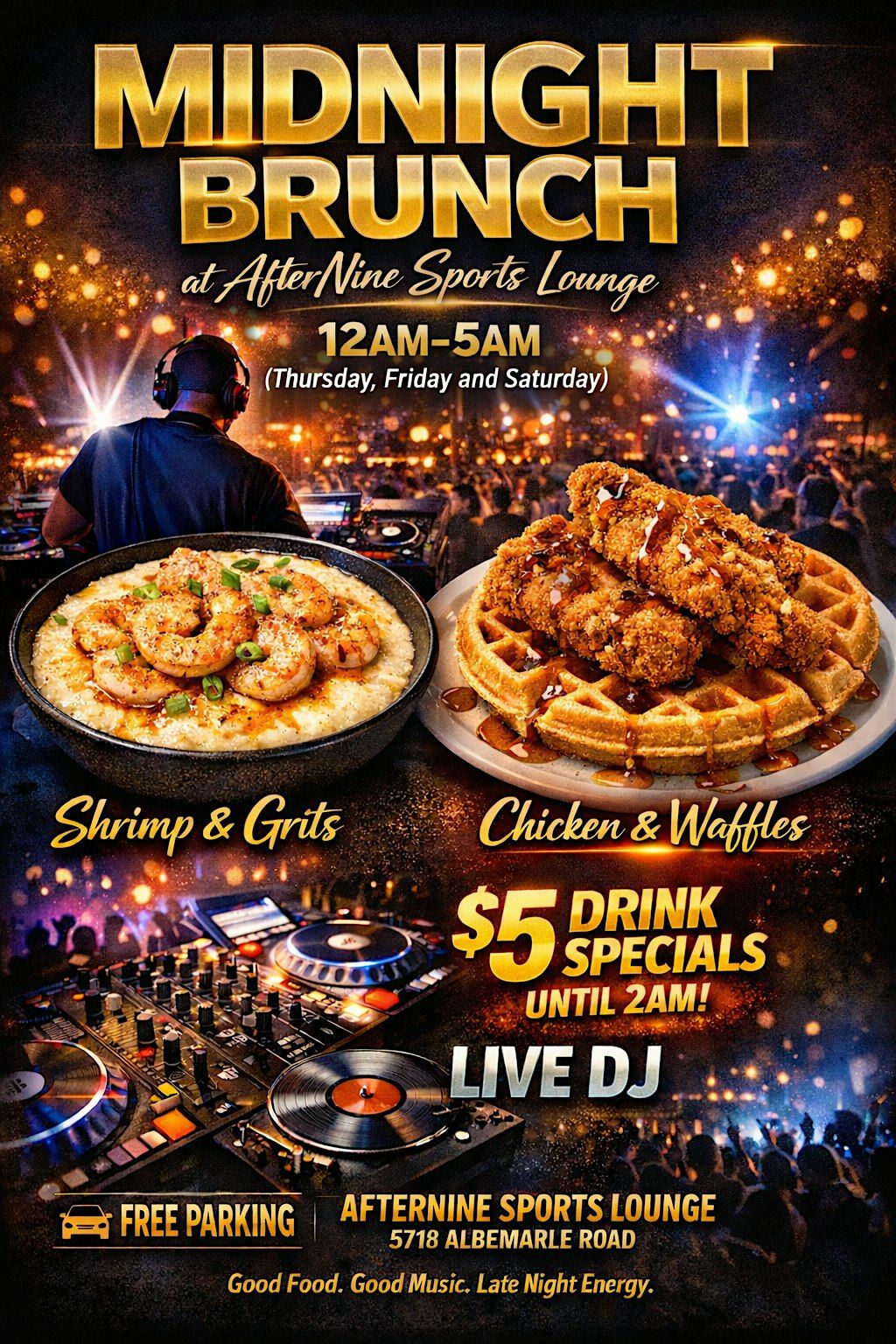Whether you’re leaving the club, getting off work, or just looking for late-night food and music, Midnight Brunch at AfterNine is the perfect spot.