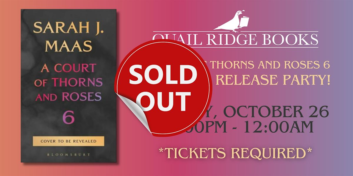 Join us for a special, after-hours party celebrating the release of A COURT OF THORNS AND ROSES 6! Party tickets include a copy of the book, plus a celebration featuring prizes, activities, trivia, refreshments, and more! Keep an eye on announcements for activities as we get closer to the party!