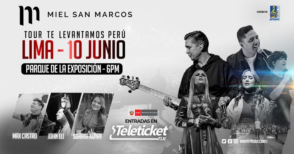 Este 2022, una de las bandas más trascendentes de música cristiana en la actualidad, Miel San Marcos, llega a Lima - Perú este 10 de JUNIO al Parque de la Exposición, para presentarse en el evento denominado "Te Levantamos Perú" post pandemia, a partir de las 6:00 pm. La agrupación ha sido reconocida con múltiples galardones incluyendo el Dove Award (USA), Premio Arpa (México) y el Visión Music Award (Guatemala). Su álbum, “Como En El Cielo” debutó #1 en iTunes Latino, así mismo en Billboard - #5 en Latin Pop Albums y #7 en Top Latin Albums.