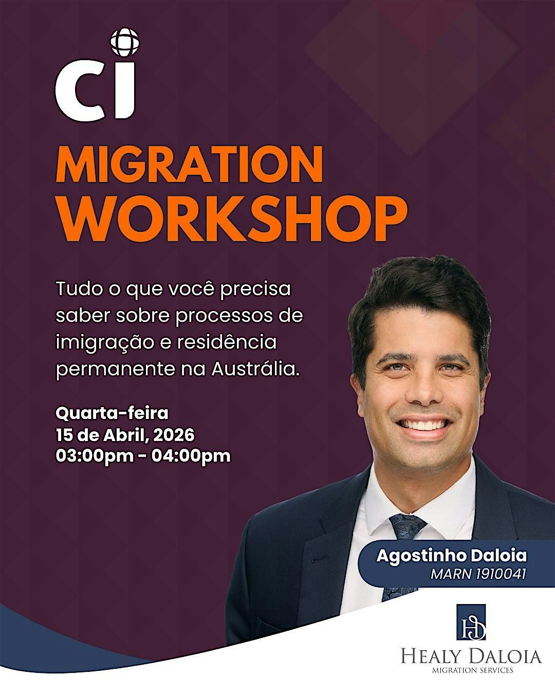 Chegou a hora de se planejar e saber suas possibilidades para alcançar a tão sonhada residência permanente na Austrália! Por isso, a CI Melbourne irá realizar, em parceria com o Agostinho Daloia, experiente Agente de Imigração Registrado (MARN 1910041) da Healy Daloia, o workshop Migrating to Australia. Durante uma hora, serão discutidos tópicos como: Skilled Visa; Sponsor Visa; Occupation List; Graduate Visa; e Partner Visa.