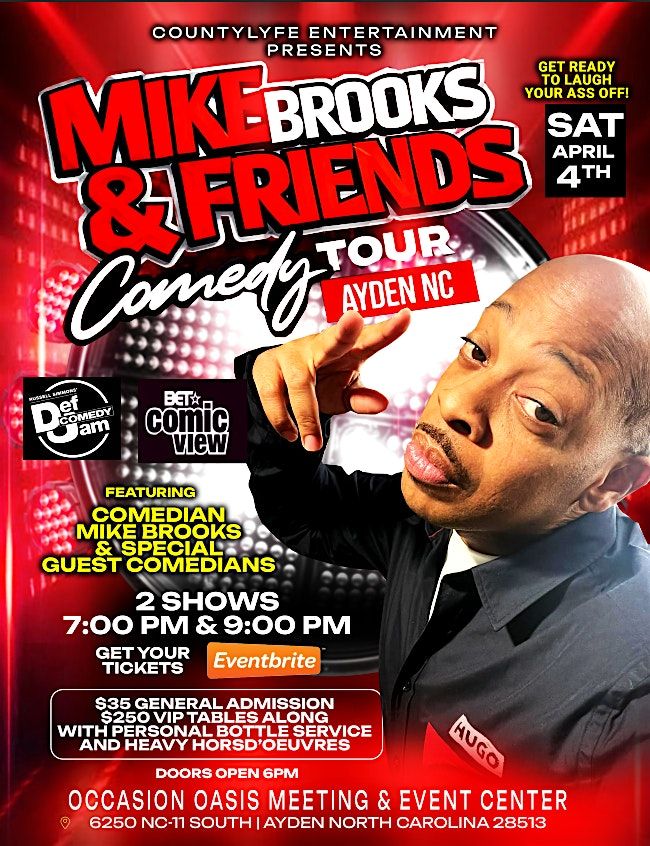 COUNTYLFE ENTERTAINMENT BROUGHT YOU THE DEF COMEDY REUNION TOUR A FEW YEARS BACK, AND NOW BRING BACK THE HILARIOUS MIKE BROOKS AND HIS FRIENDS. GET READY TO LAUGH YOUR ASS OFF WITH SOME OF THE BEST COMEDIANS IN THE GAME. MIKE BROOKS HAS BEEN FEATURED ON HBO COMICVIEW, DEF COMEDY JAM, P DIDDY BAD BOYS OF COMEDY AND MANY MORE PLATFORMS FOR COMEDY. WE HAVE INCLUDED A TWO DRINK MINMUM FOR EACH TICKET SOLD! IF YOU ARE NOT A DRINKER NO PROBLEM!!! WE ALSO OFFER NON -ALCOHOLIC BEVERAGES AS WELL. VIP WILL INCLUDE A BOTTLE OF WINE AND HEAVY HORS D'OEUVRES IN FRONT ROW SEATING!! GET YOUR TICKETS NOW BECAUSE THIS SHOW WILL SELL OUT QUICKLY!